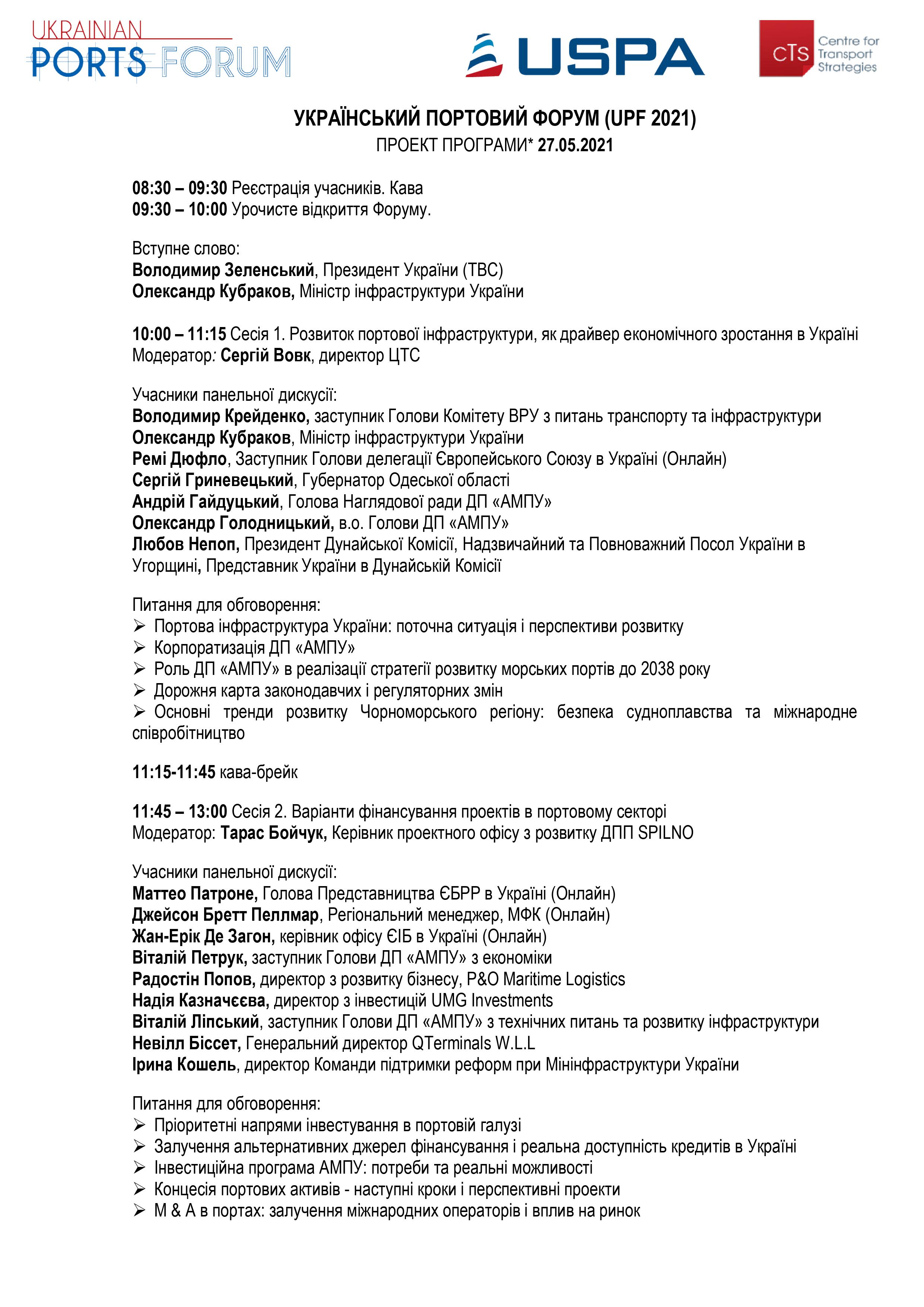 Український портовий форум 2021 стане ефективним майданчиком для презентації ключових трендів, обговорення досягнень і бачення подальшого розвитку інфраструктури країни, в тому числі щодо інвестиційного потенціалу портової галузі України. Планів з реалізації проектів державно-приватного партнерства, діджіталізації процесів в портовій галузі та інше.В рамках панельних сесій і робочих дискусій будуть обговорені наступні питання :