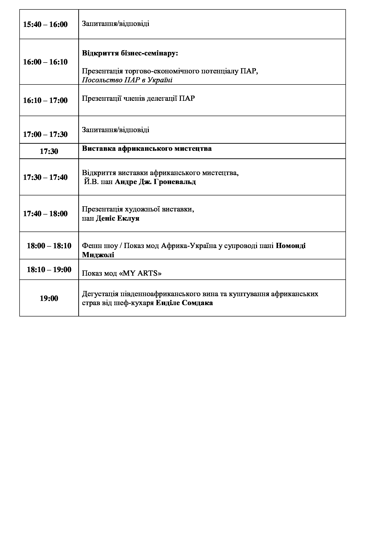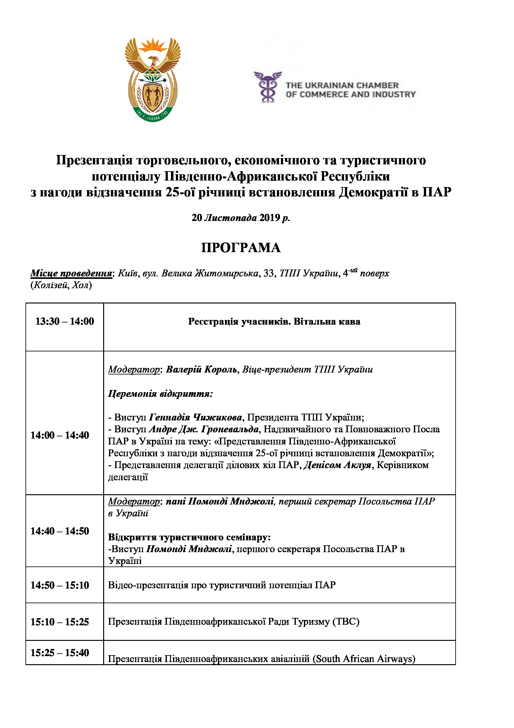ТПП України разом з Посольством Південно-Африканської Республіки в Україні 20 листопада 2019 року проводитимуть презентацію торговельного, економічного та туристичного потенціалу Південно-Африканської Республіки з нагоди відзначення 25-ої річниці встановлення Демократії в ПАР.