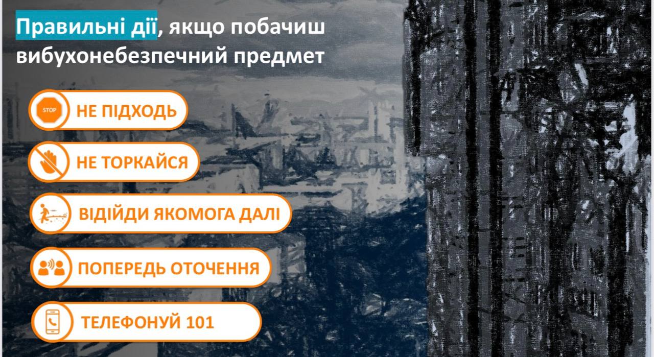 Нагадуємо: у разі виявлення підозрілих предметів не наближайтеся до них, не торкайтеся та обов’язково повідомте відповідні служби за номером 101. Бережіть себе та будьте уважними до власної безпеки та безпеки оточуючих.