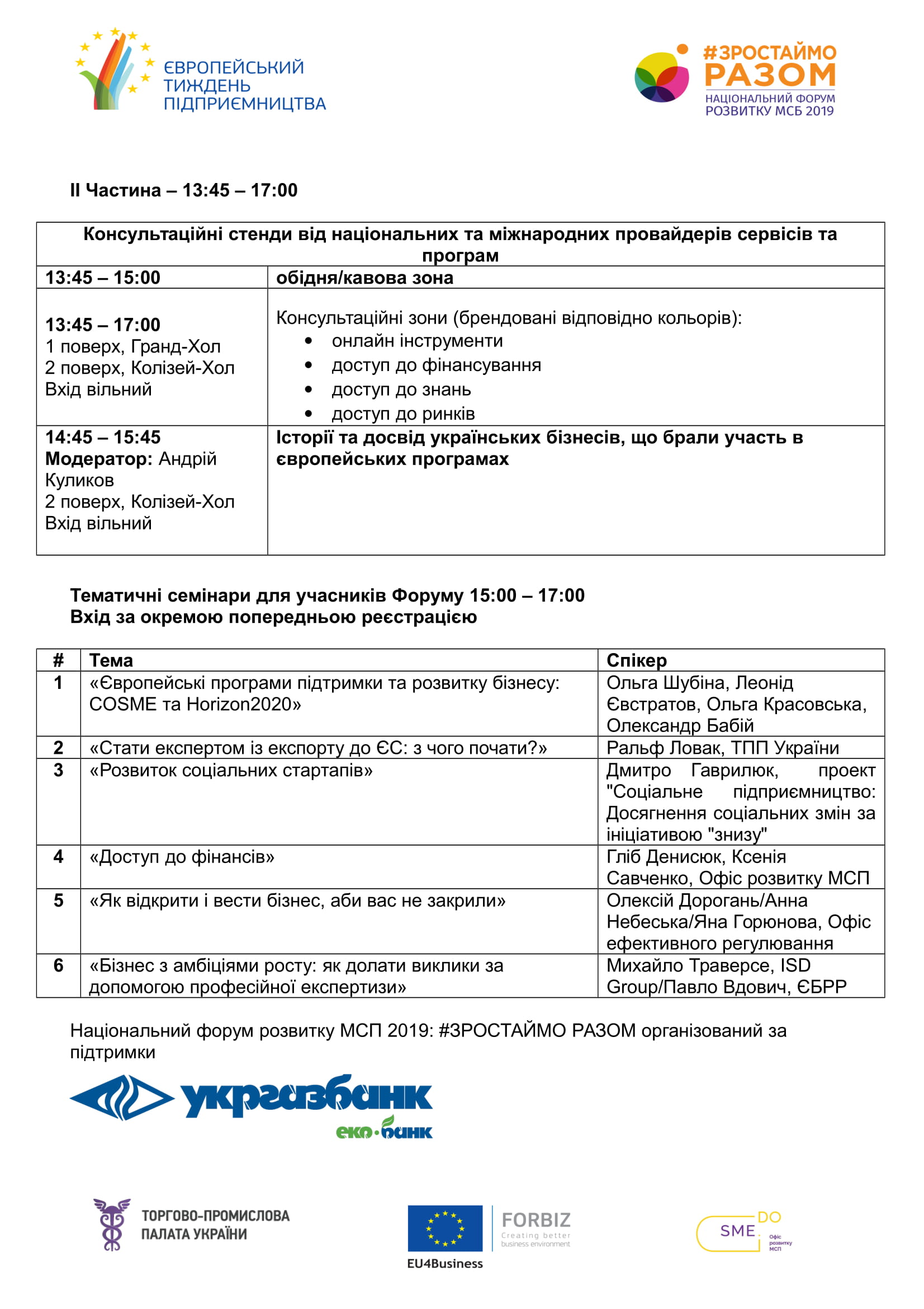Цьогорічний Форум буде заключним в низці заходів Європейського тижня МСП в Україні, організаторами якого виступають ТПП України, Офіс Розвитку Малого і Середнього Підприємництва при Мінеконорозвитку та проект EU4Business/FORBIZ за фінансової підтримки Делегації Європейського Союзу в Україні.