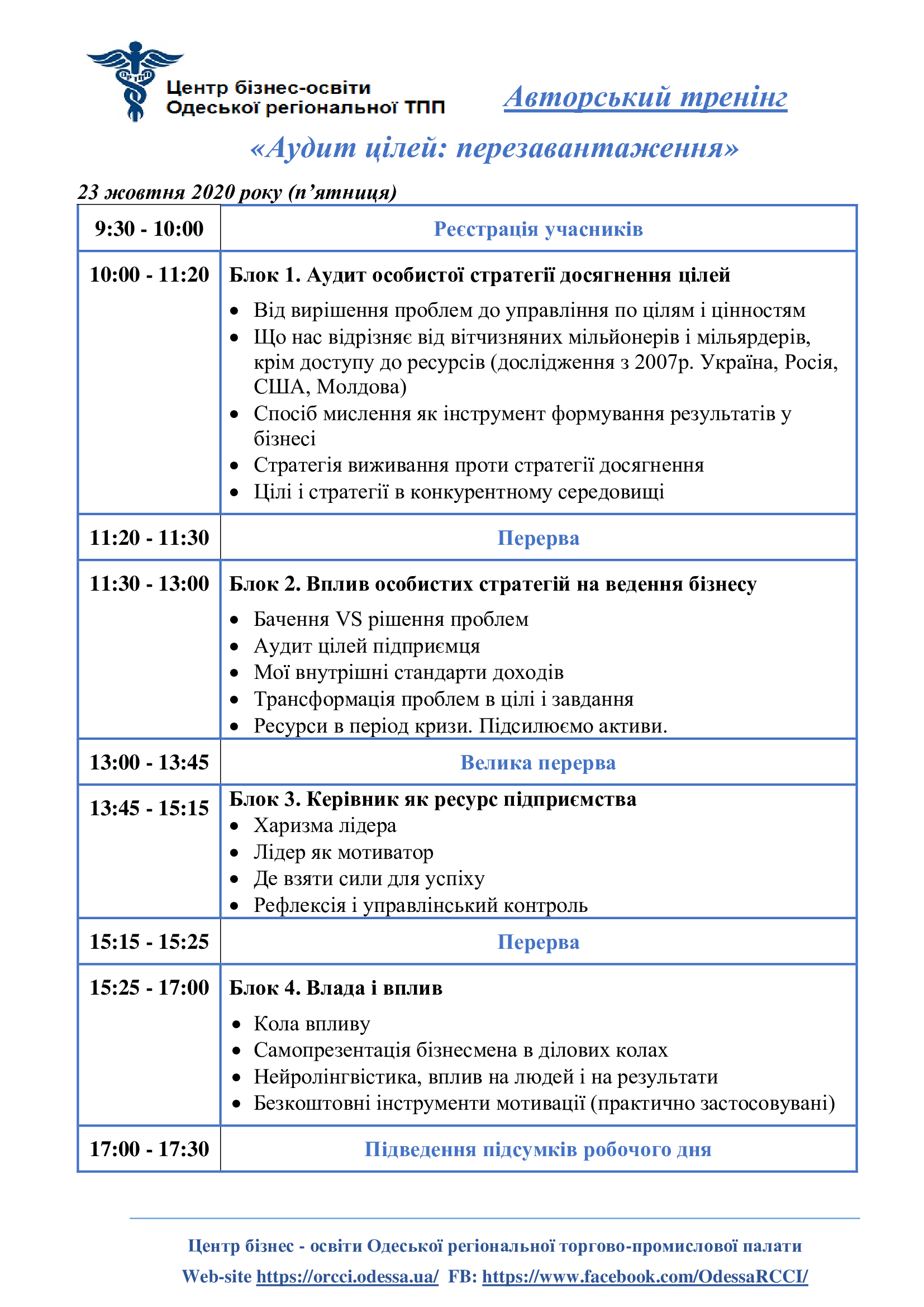 Запрошуємо Вас до участі у авторському тренінгу "Аудит цілей: перезавантаження", що відбудеться 23 жовтня 2020 року в приміщенні конференц-залу Одеської регіональної торгово-промислової палати (ОРТПП) (перший поверх) м. Одеса, вул. Базарна, 47.